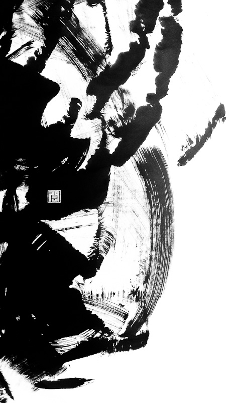 An abstract painting of pixels of colours floating in the wind. The different colours are represented by different tones of the ink, each of a different weight, density and force, scattering in the air in various directions as led by the wind. The darker and denser areas (such as where the artist stamp is) represent the “eye” of the wind – powerful, peaceful and quiet. Such is the colourful nature. What colours do you see?