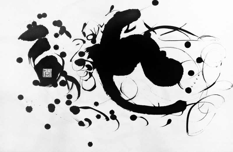 An abstract painting of a bird flying towards a rock which has been shattered into 3 pieces. The artist stamp indicates the artist is on the rock gazing at this worldly creature. Energy and natural phenomena are portrayed here around the bird and the artist with the use of light strokes. Although there is still a distance between the artist and the bird, the two, human and nature, are in fact already connected. Amazing world!